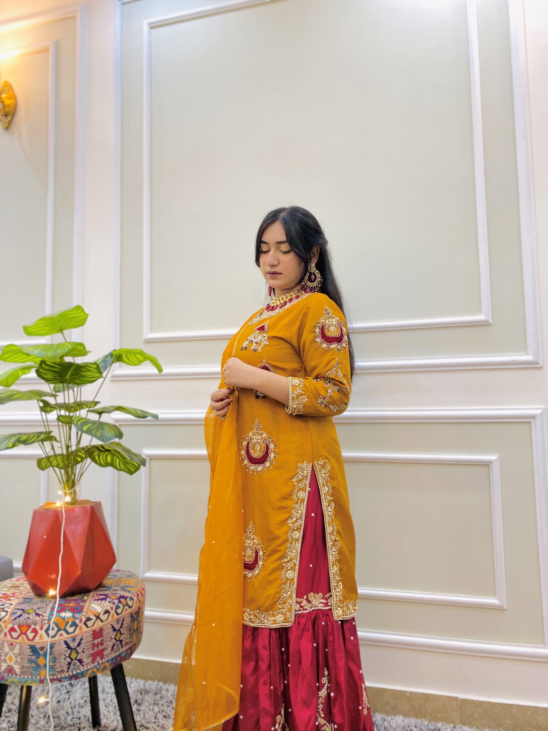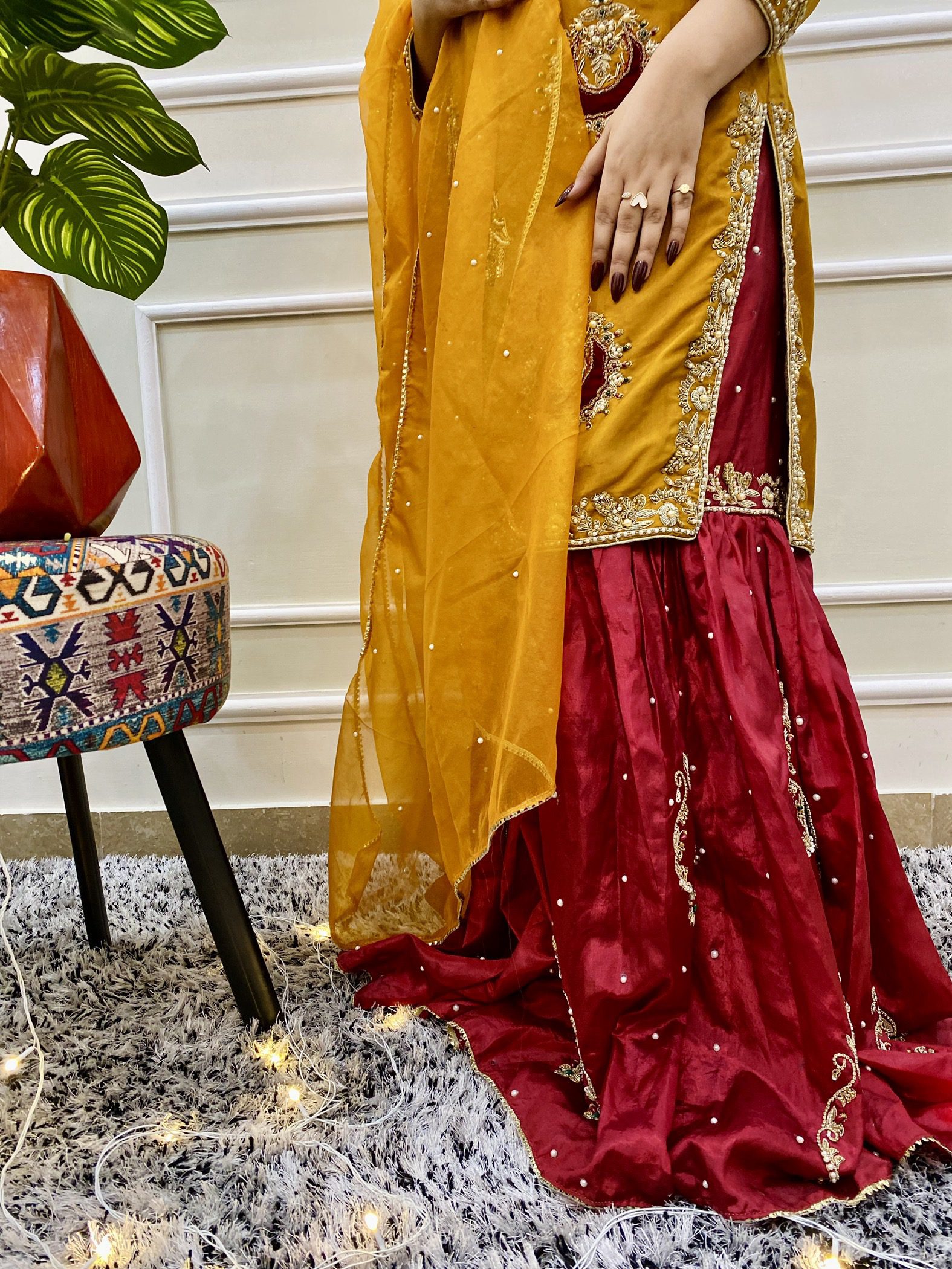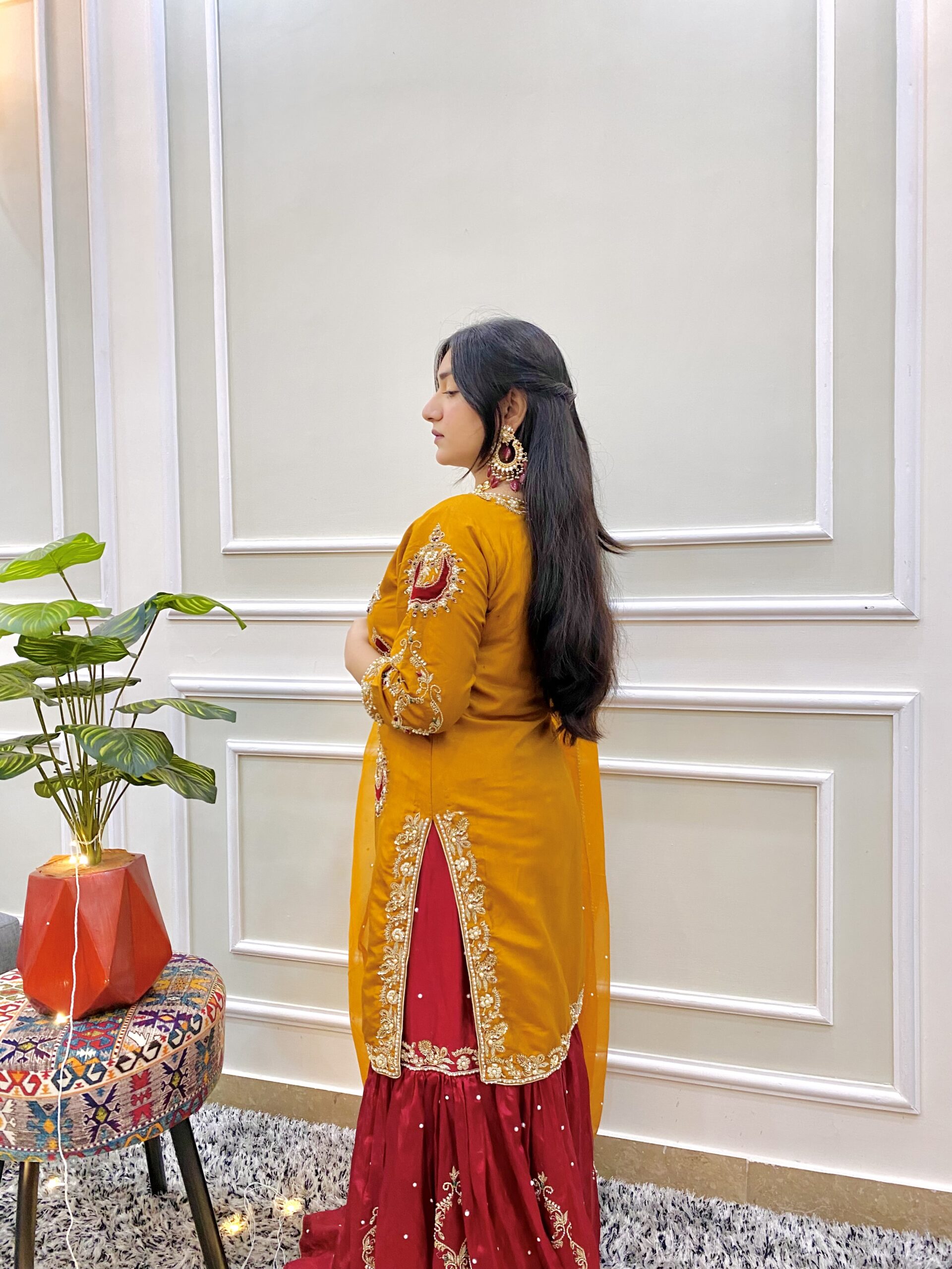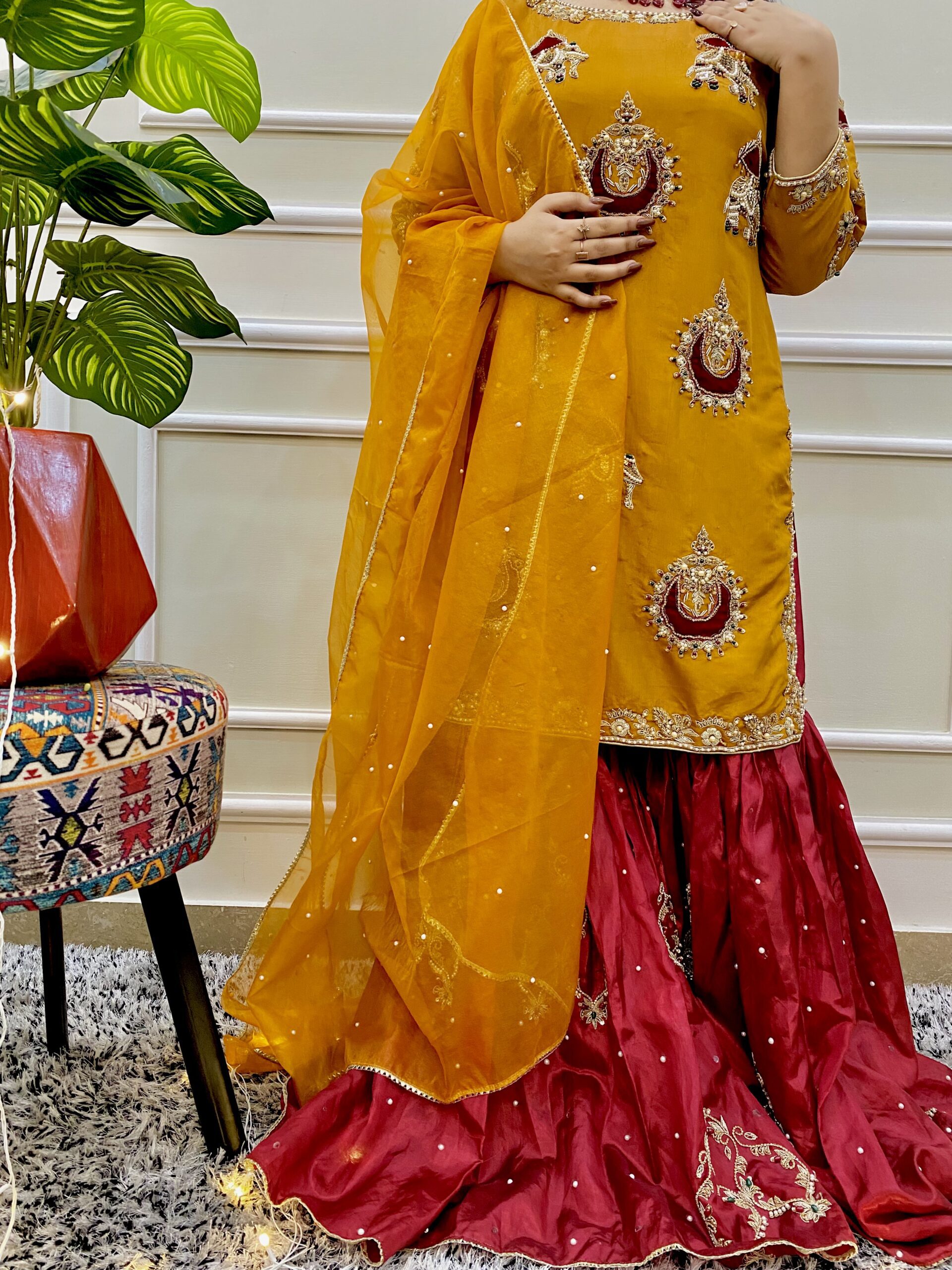 This striking ensemble features a richly detailed yellow shirt paired with a vibrant red gharara. Designed with classic contrasts and elegant embellishments, itβs a celebration of culture and grace β perfect for weddings and festive gatherings.