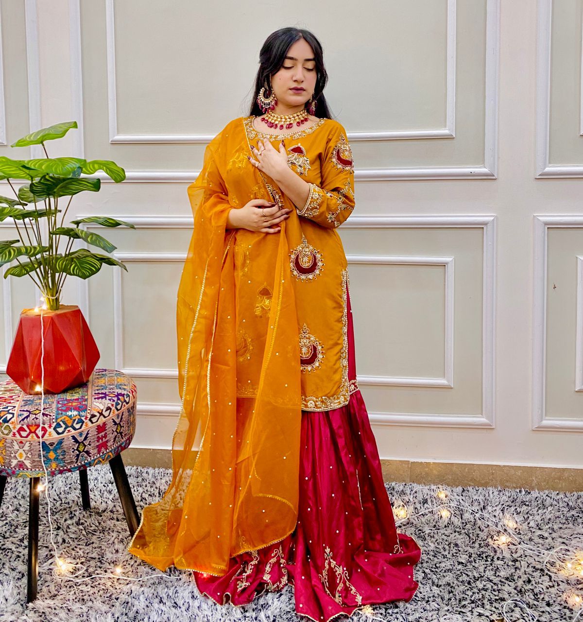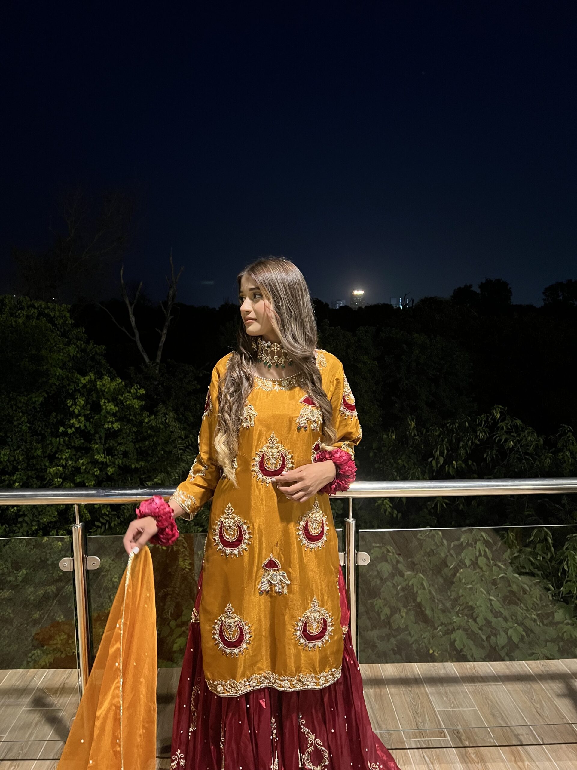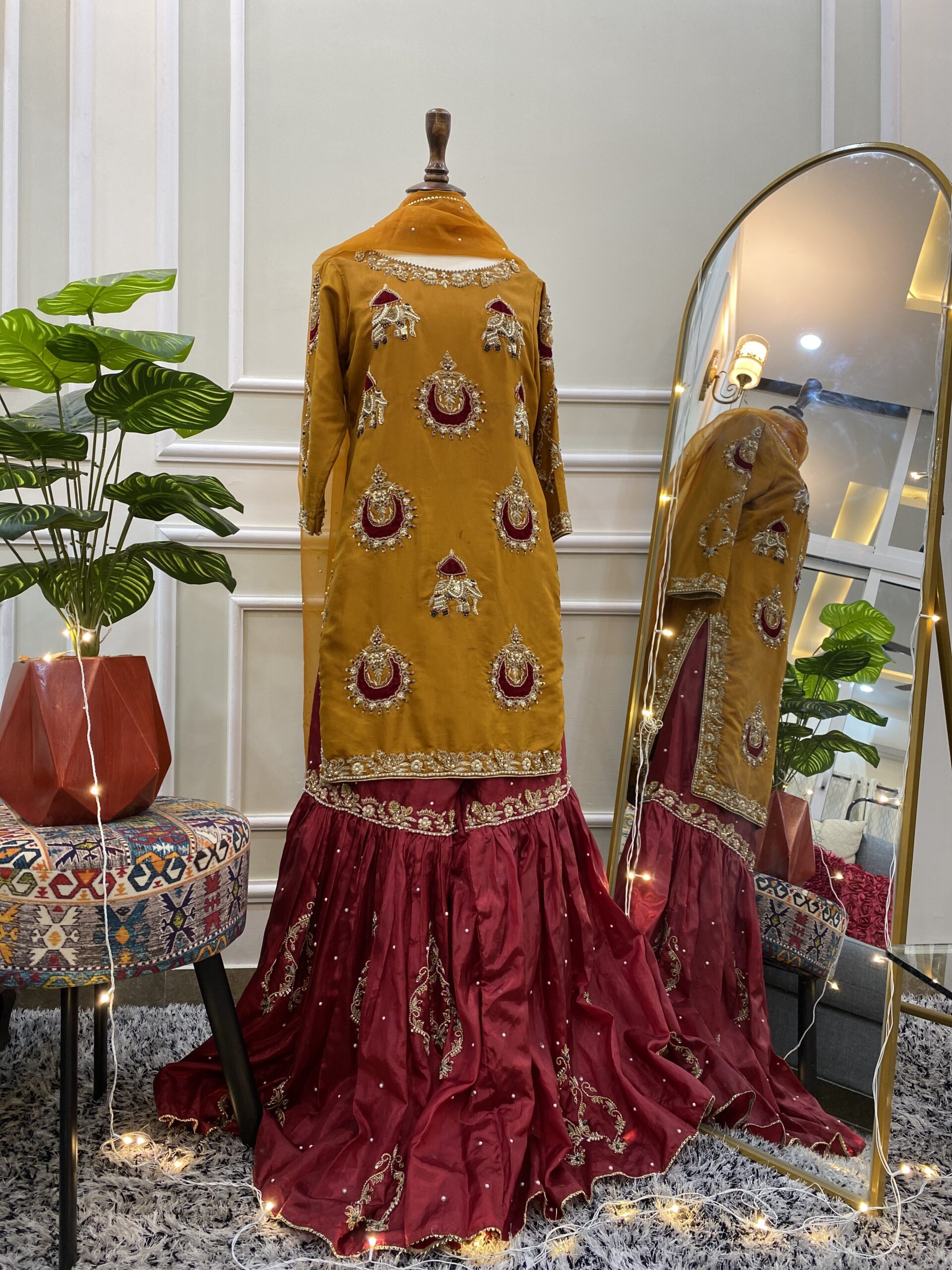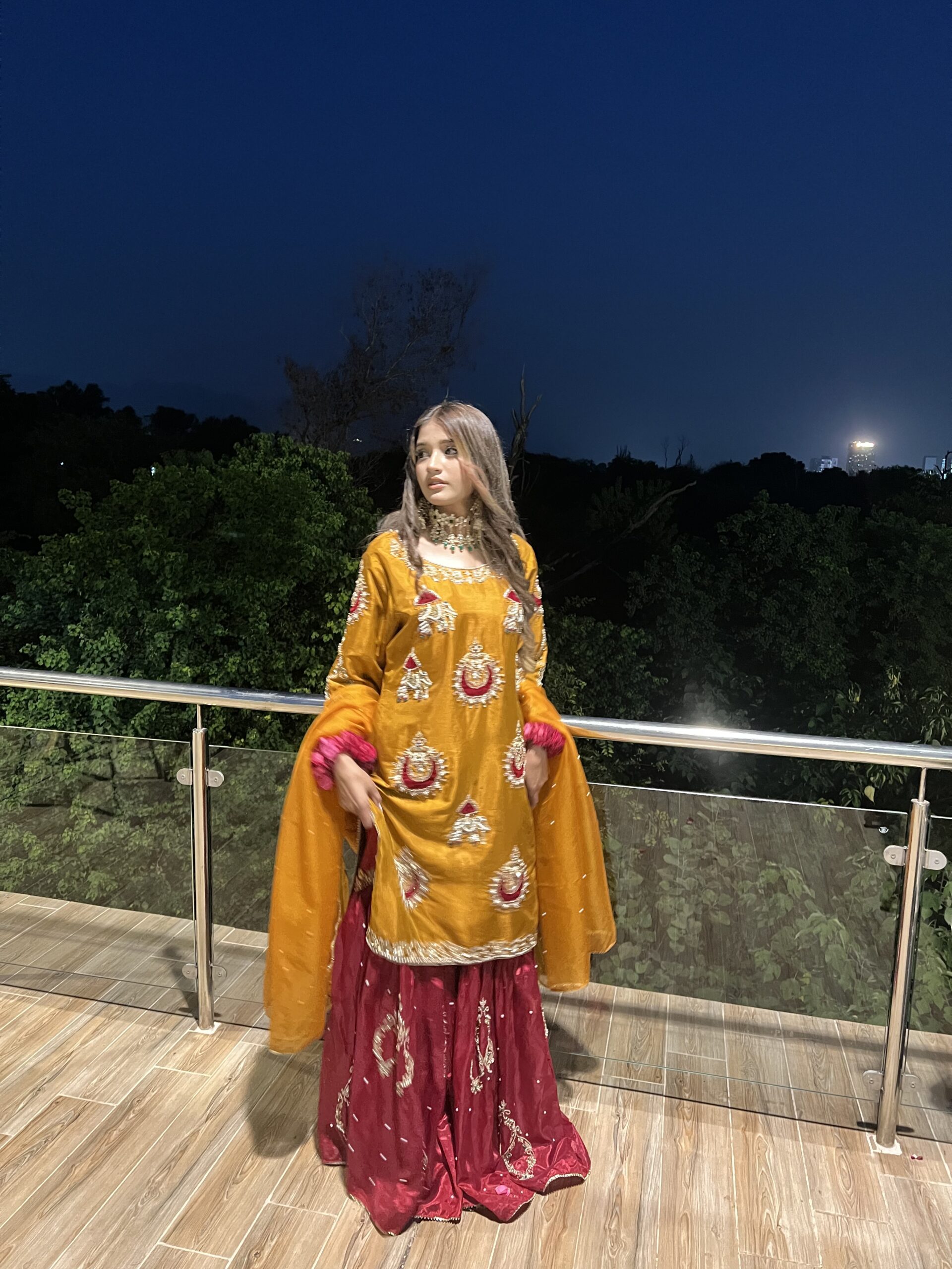 This striking ensemble features a richly detailed yellow shirt paired with a vibrant red gharara. Designed with classic contrasts and elegant embellishments, itβs a celebration of culture and grace β perfect for weddings and festive gatherings.