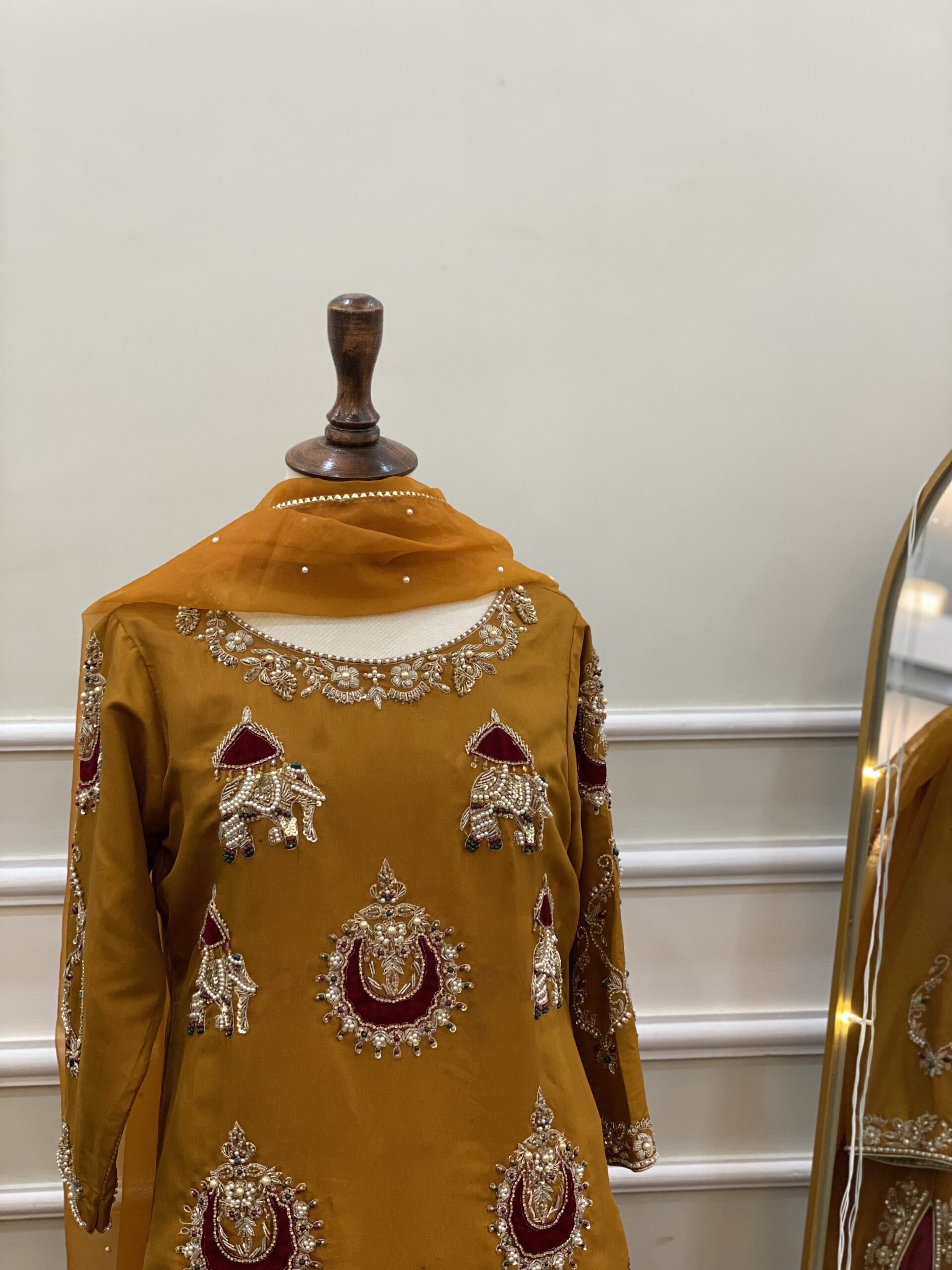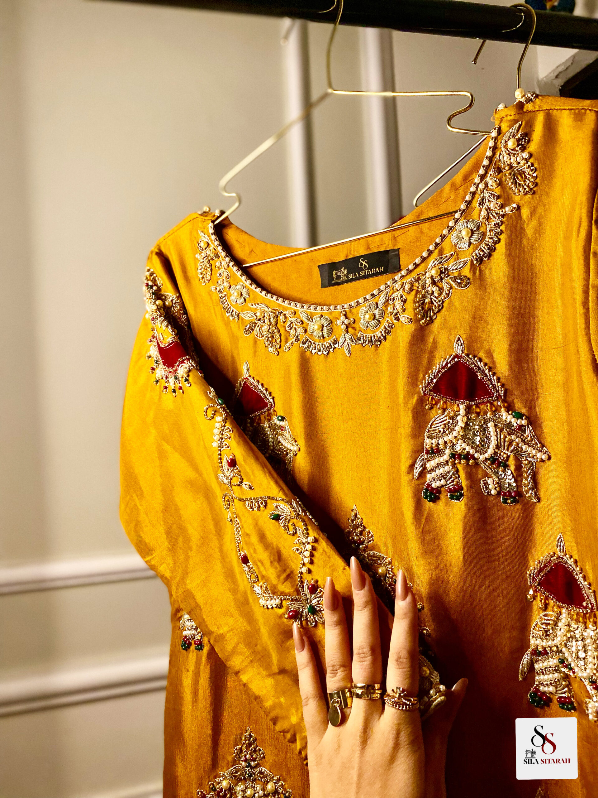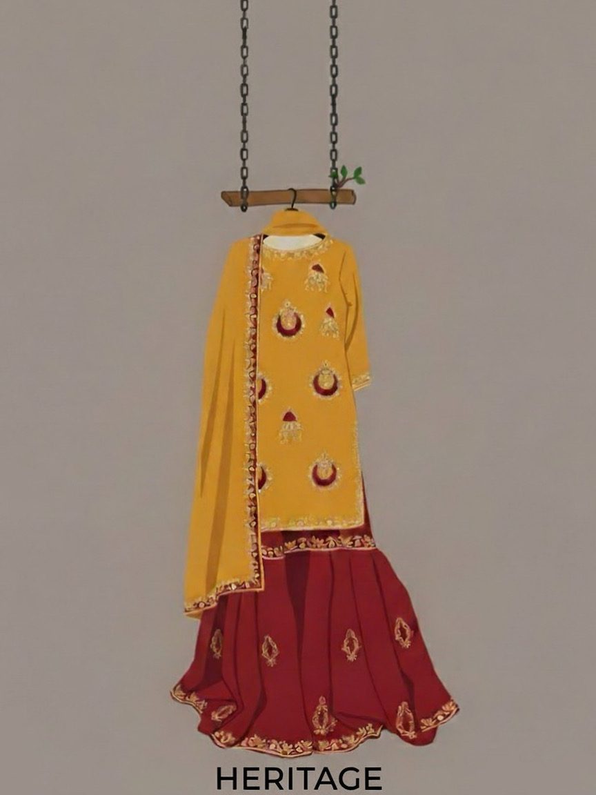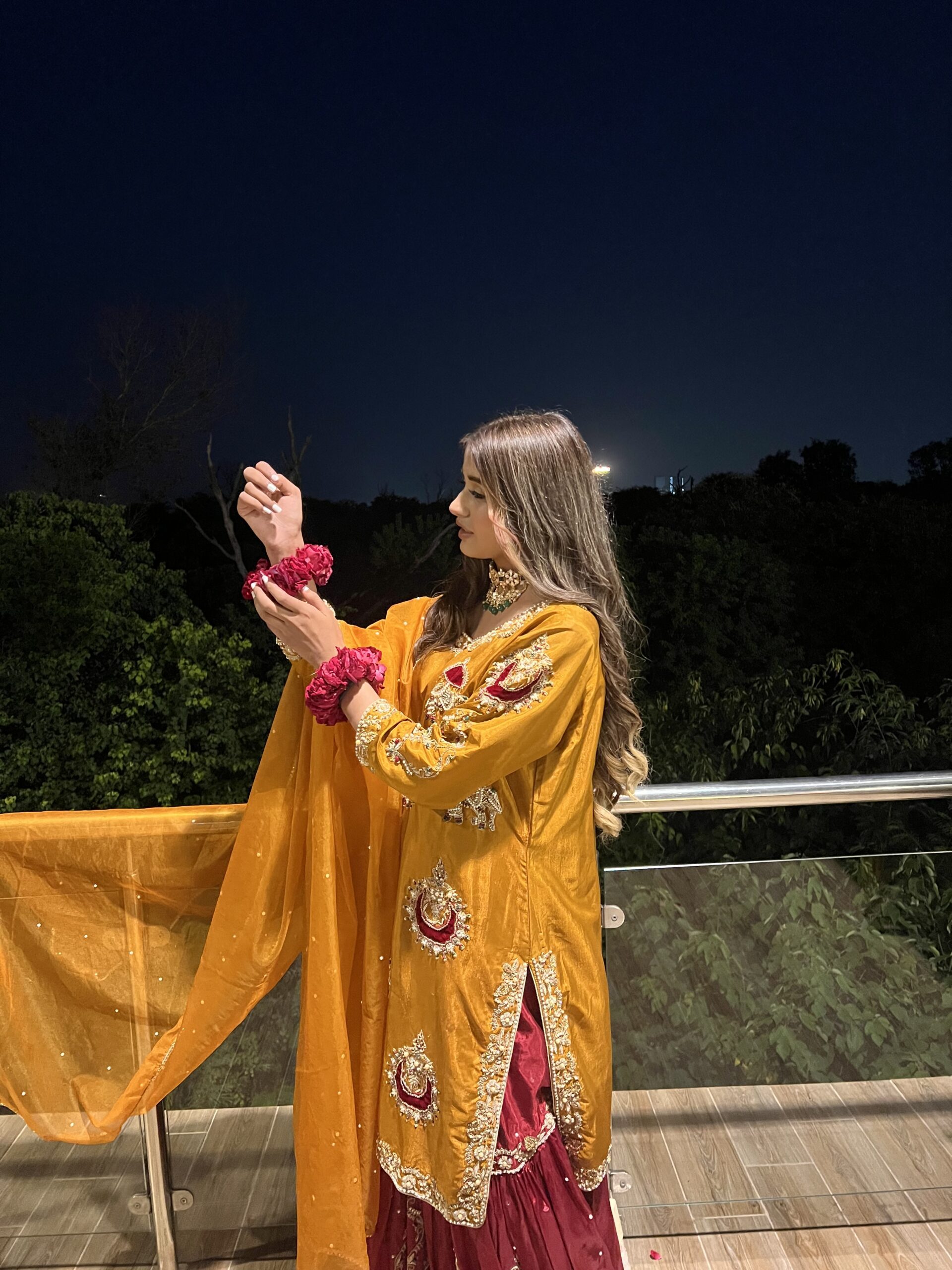 This striking ensemble features a richly detailed yellow shirt paired with a vibrant red gharara. Designed with classic contrasts and elegant embellishments, itβs a celebration of culture and grace β perfect for weddings and festive gatherings.
