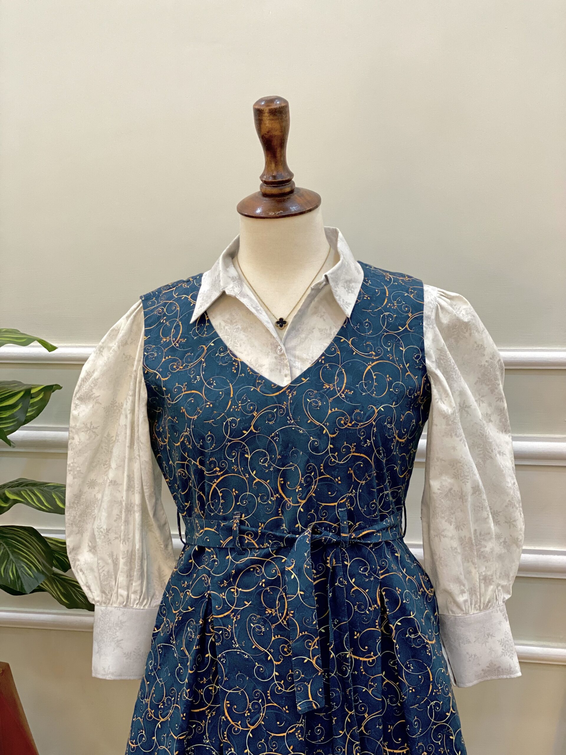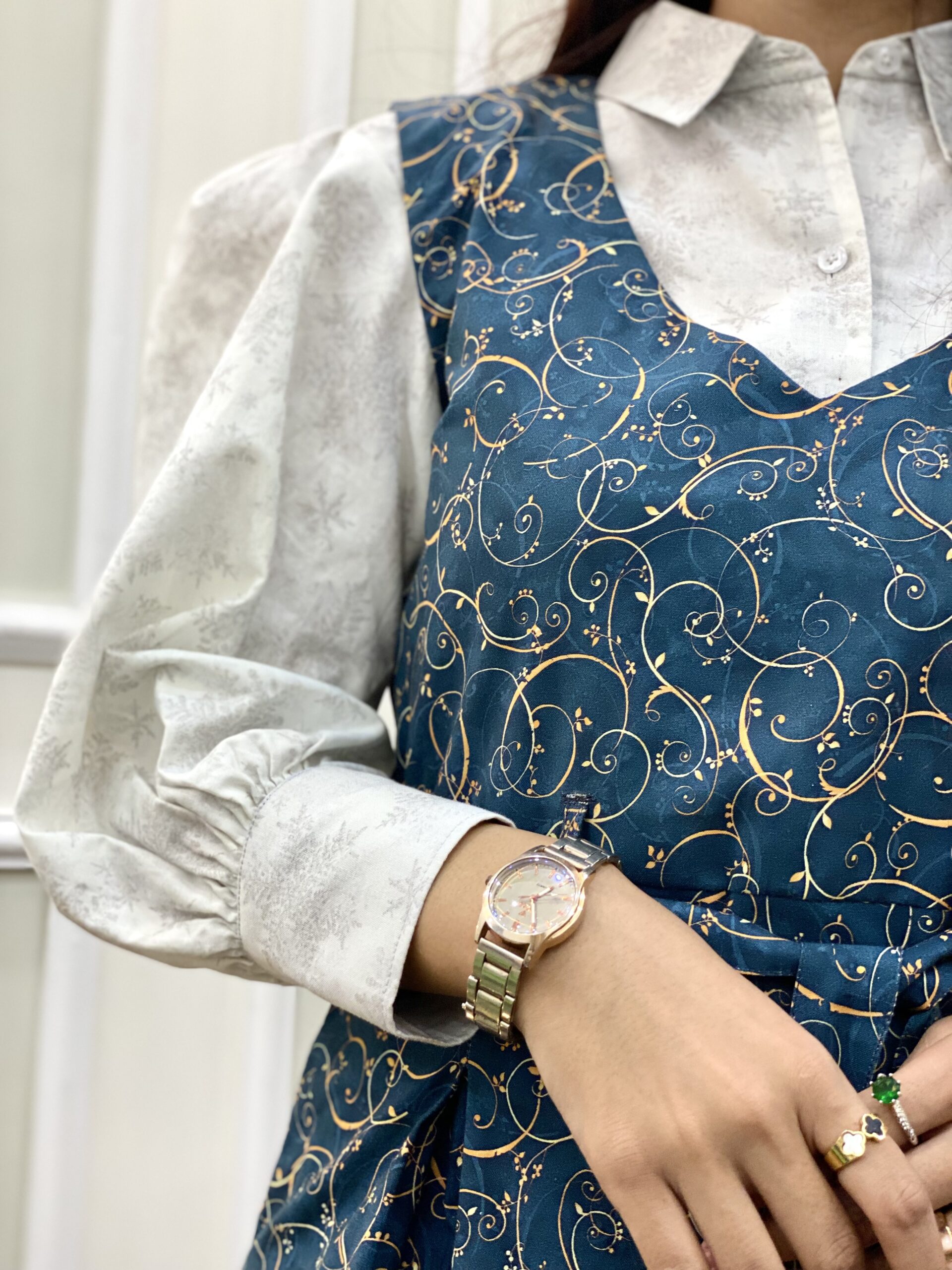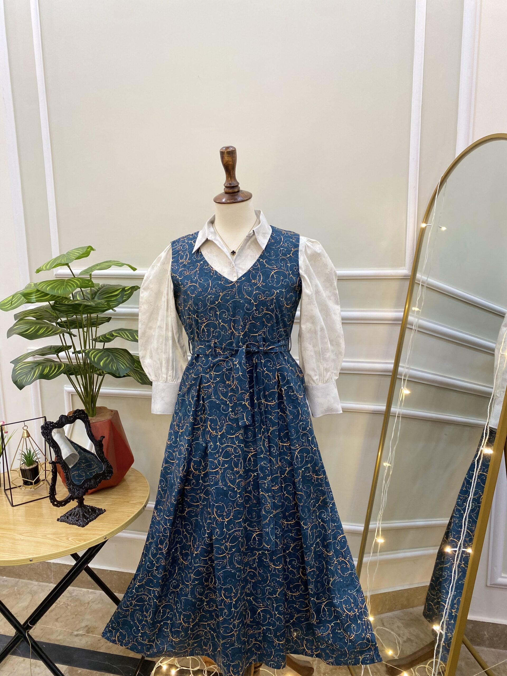 This deep blue printed dress is designed for effortless grace. Featuring a structured bodice layered over a soft white shirt, it’s crafted from cozy winter cotton with a flowy silhouette — perfect for campus days, casual meet-ups, or polished everyday wear.